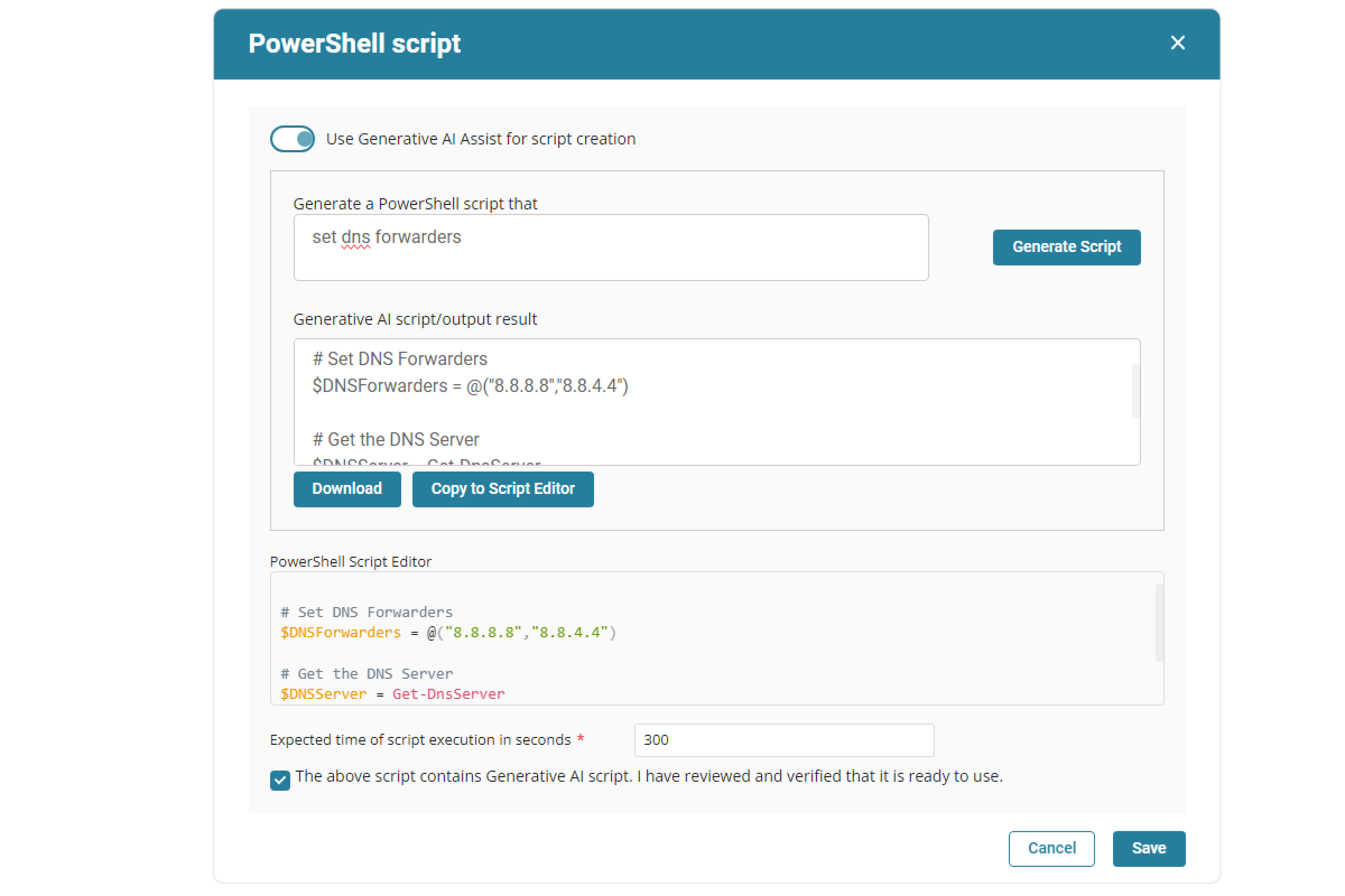 Create, review, and run PowerShell scripts in minutes! AI-generated scripts always require approval, so your team stays in control.