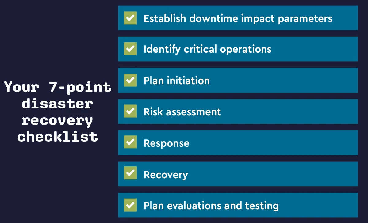 Creating a comprehensive disaster recovery plan is essential in today’s digital world where cyberthreats are constantly evolving and other risk factors are always present. Disaster recovery plans will differ depending on your client's business needs. With that said, the following steps are a good part of your 7-point disaster recovery checklist: